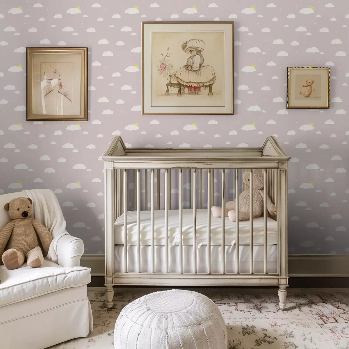 Papel tapiz Nubes suaves, estrellas y sol sobre un fondo gris rosáceo Nr. a00652v2