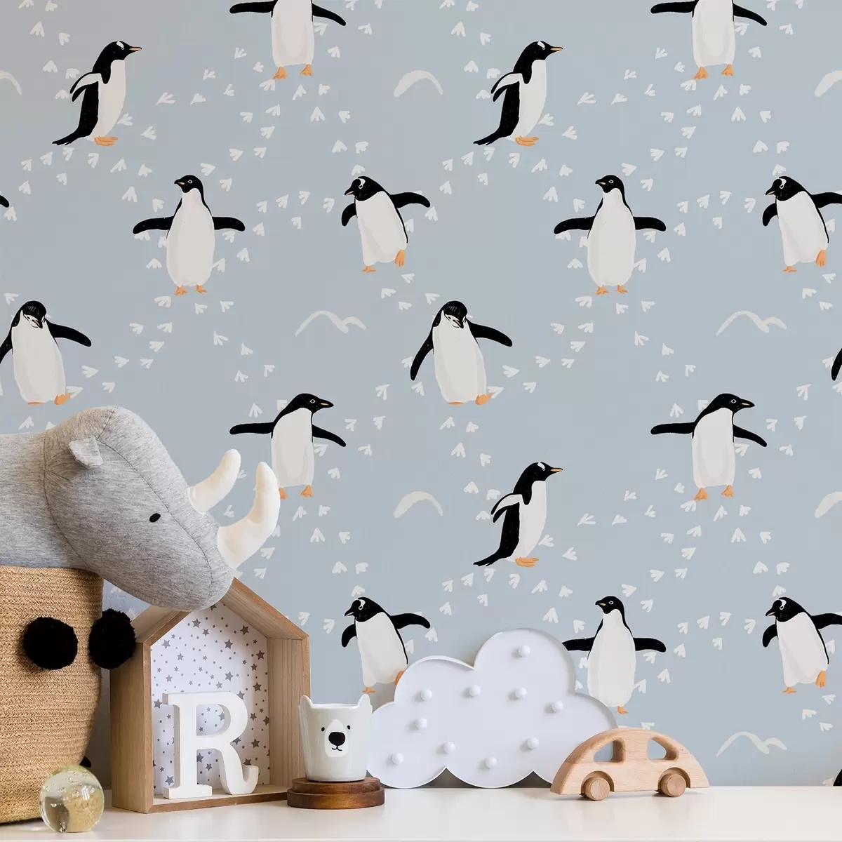 Papel tapiz Pingüinos sobre fondo azul claro, ritmo de huellas Nr. a00655v2