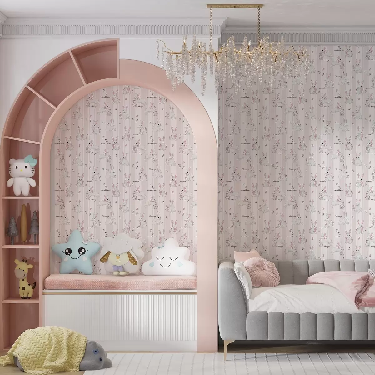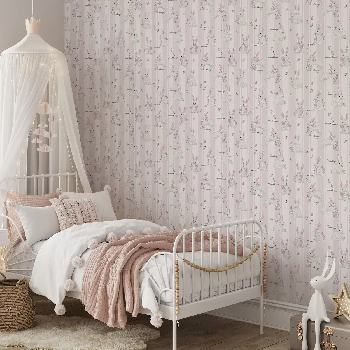 Papel tapiz Conejitos con lazos, rayas rosas y pequeñas letras. Nr. a00657