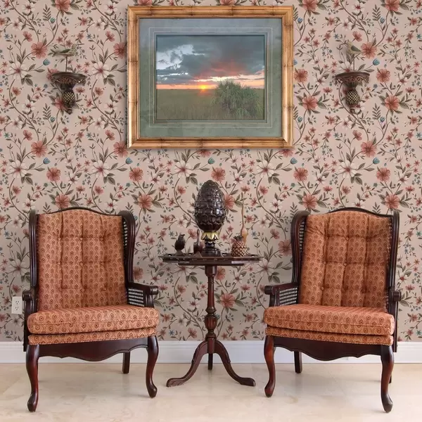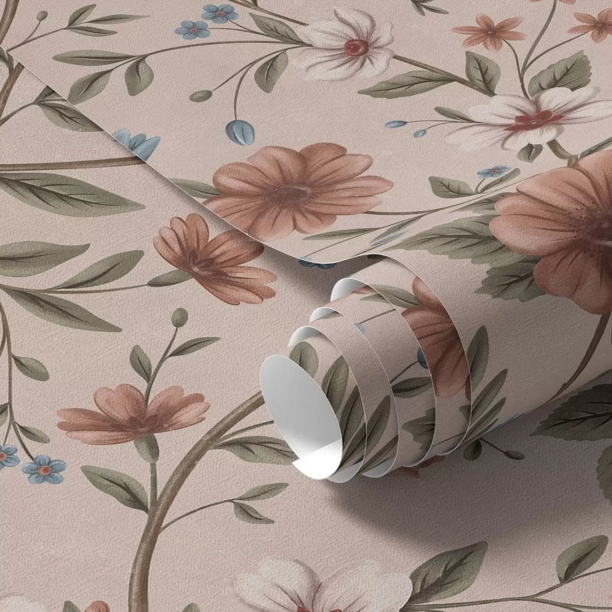 Papel tapiz Flores y follaje de color rosa coral sobre fondo rosa empolvado Nr. a00667