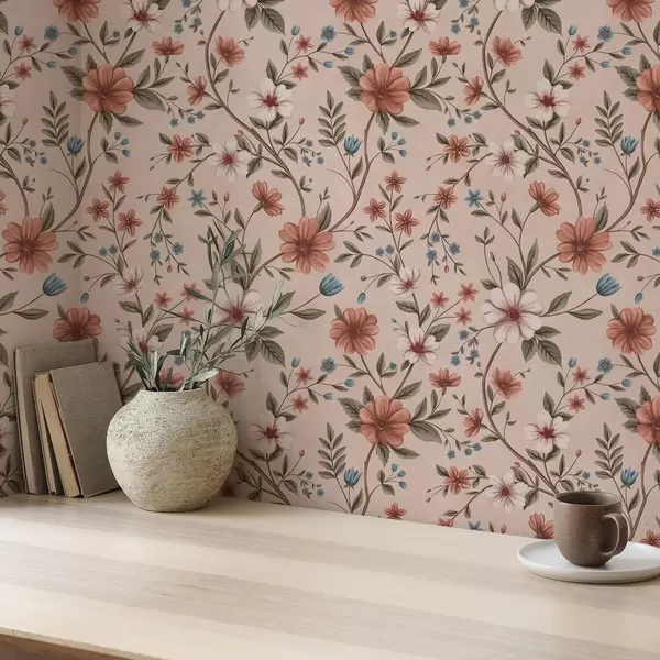 Papel tapiz Flores y follaje de color rosa coral sobre fondo rosa empolvado Nr. a00667