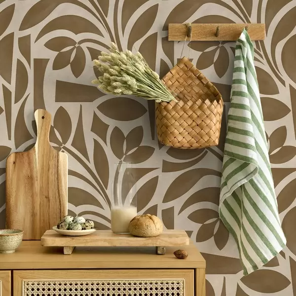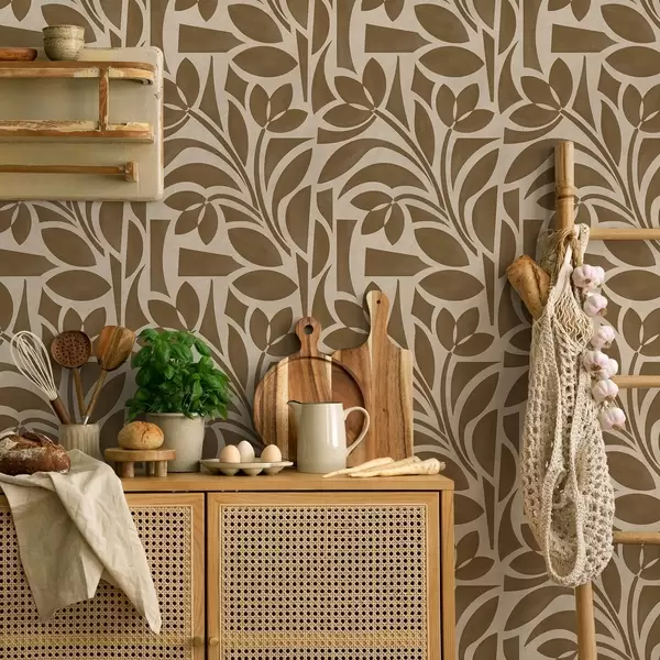 Papel tapiz Siluetas geométricas de hojas, marrón caramelo sobre beige Nr. a00679