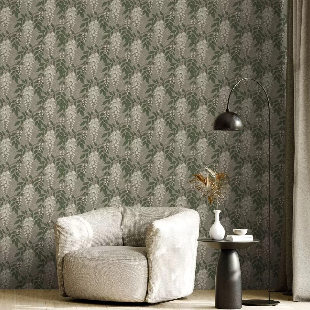 Papel tapiz Glicinia clara sobre fondo gris oliva, racimos en cascada Nr. a00694