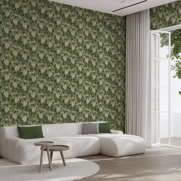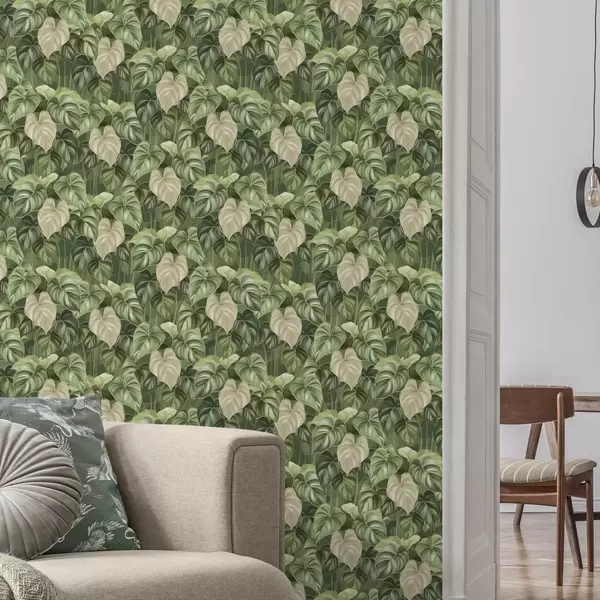 Papel tapiz Exuberantes hojas de filodendro en tonos verdes y marfil Nr. a00695