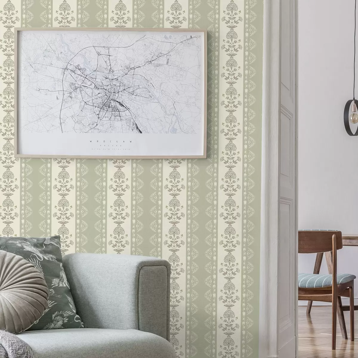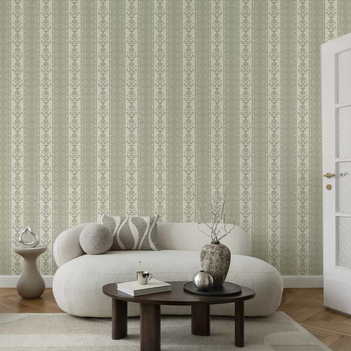 Papel tapiz Adorno rayado con columnas florales en tonos salvia Nr. a00719