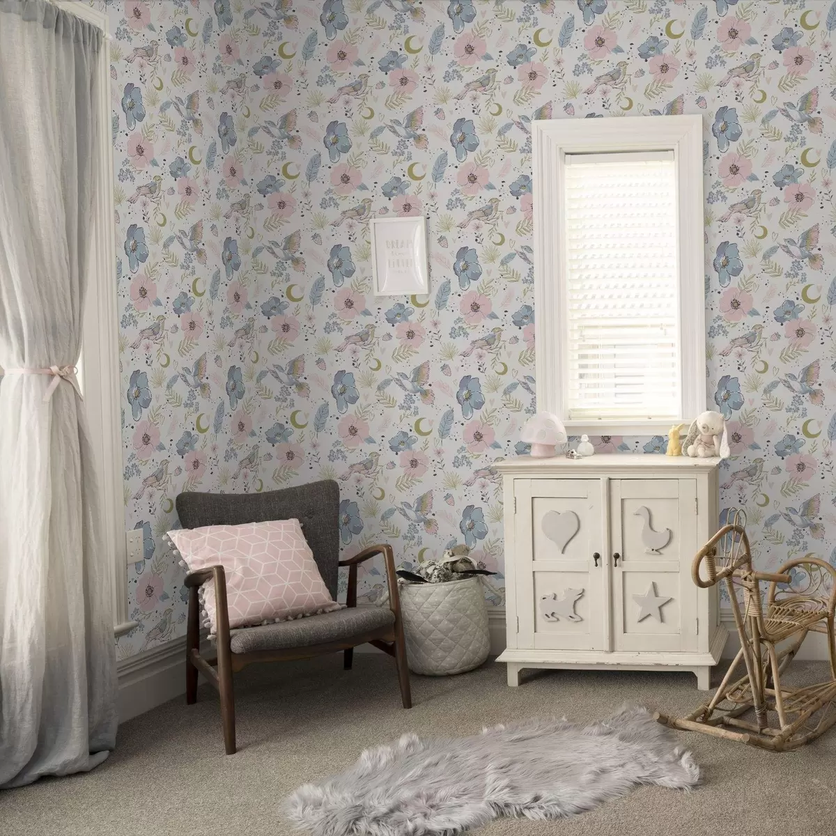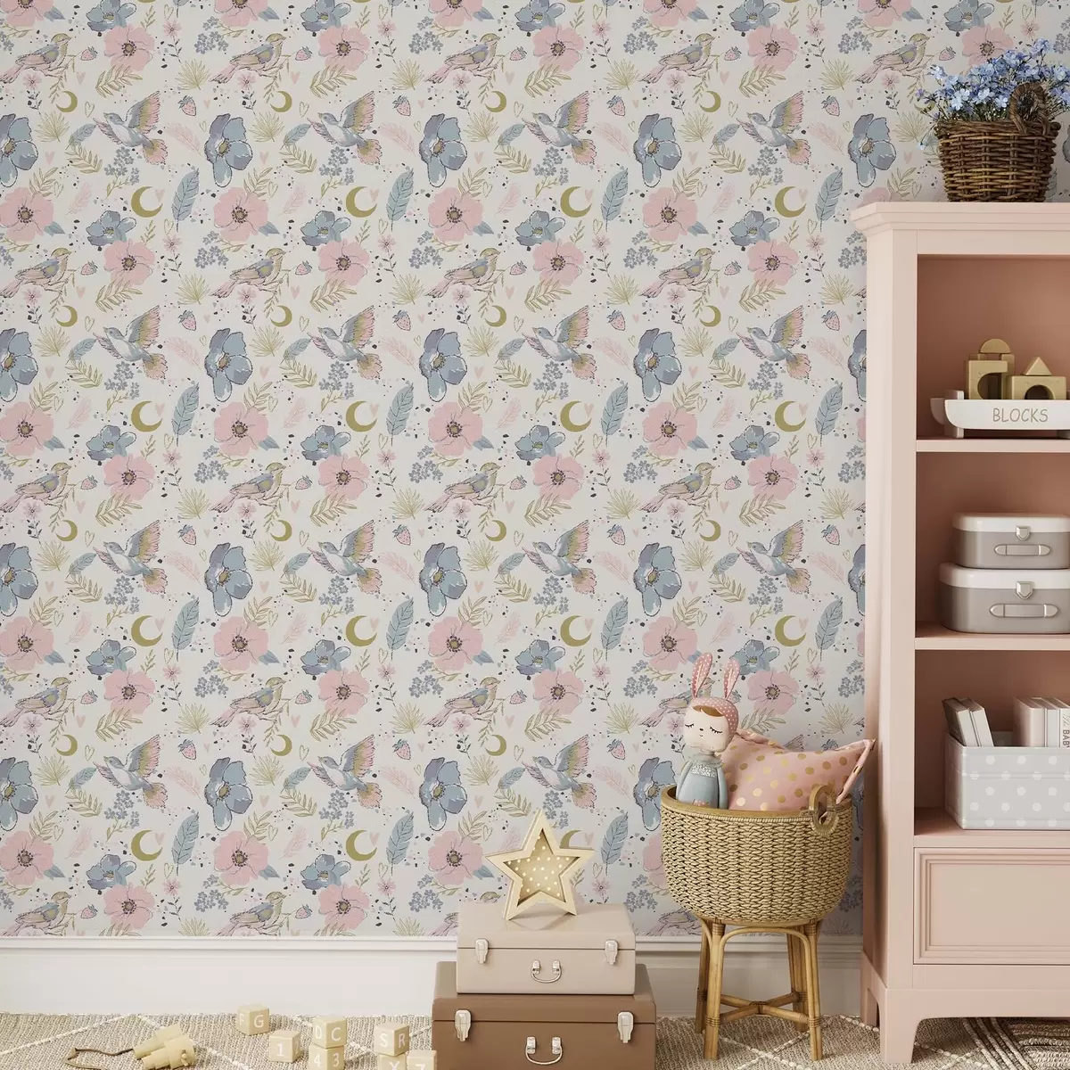 Papel tapiz Aves y flores en tonos pastel con lunas crecientes sobre fondo blanco Nr. a00721