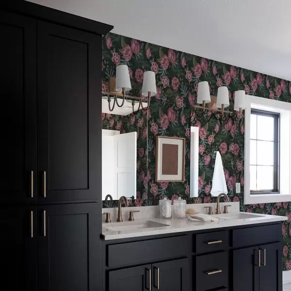 Papel pintado Flora oscura con flores y hojas rosadas, fondo intenso a00724