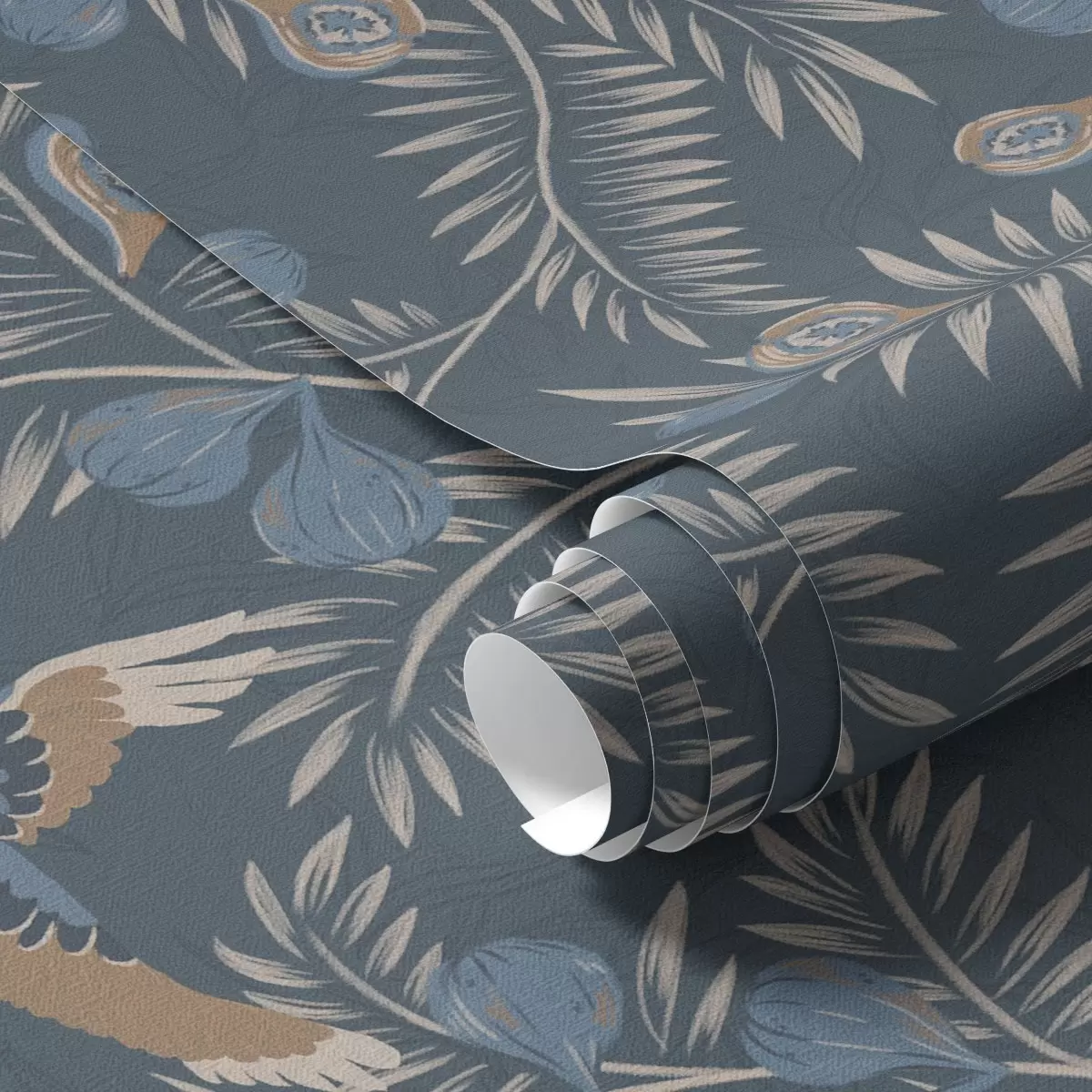 Papel tapiz Pájaro entre frutos azules y hojas de palmera, índigo Nr. a00726