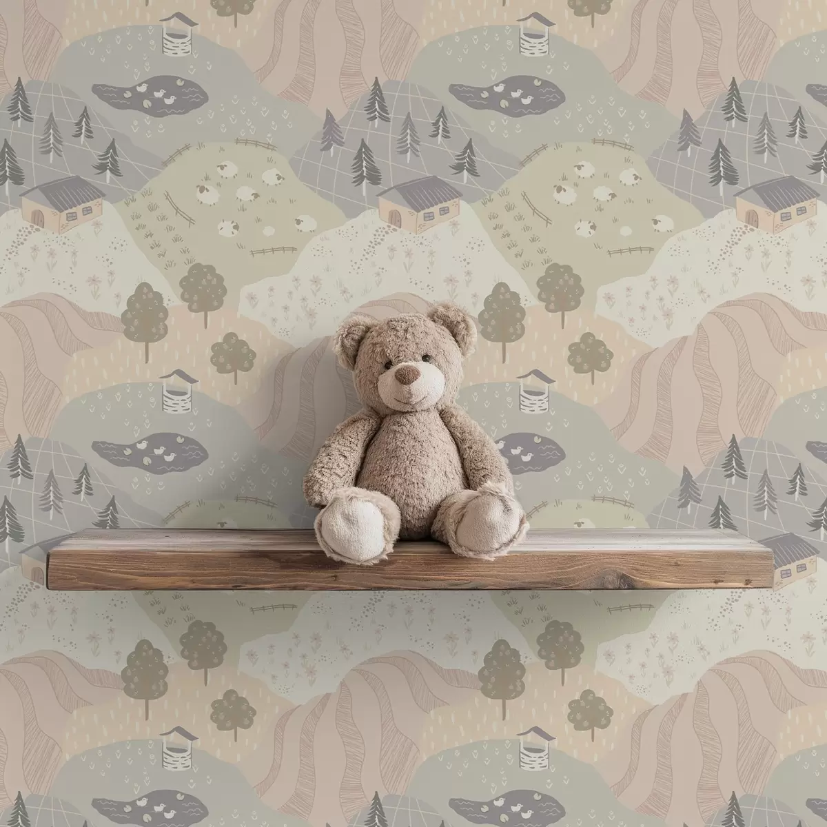 Papel tapiz Campiña de cuento de hadas con árboles, gansos y ovejas Nr. a00728