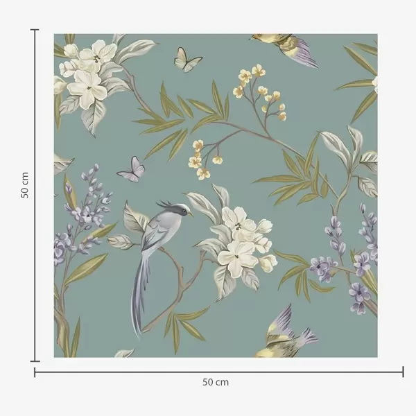 Papel tapiz Pájaros, flores y mariposas sobre un fondo azul grisáceo. Nr. a00735
