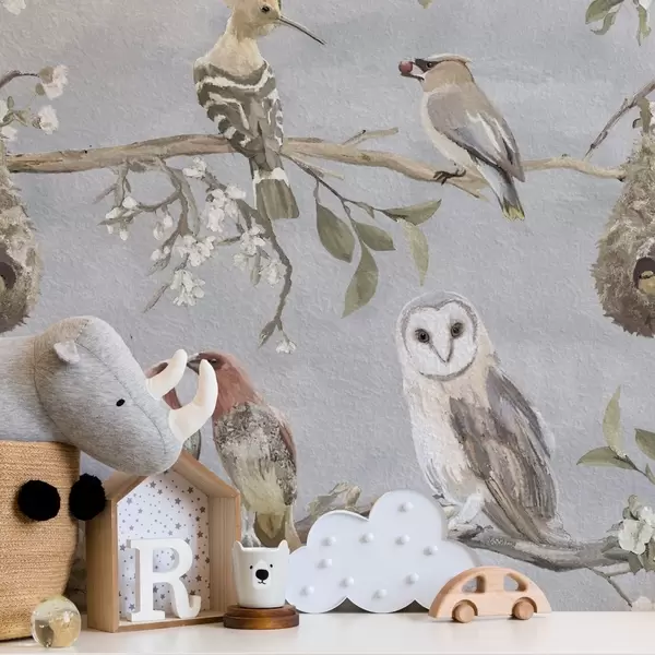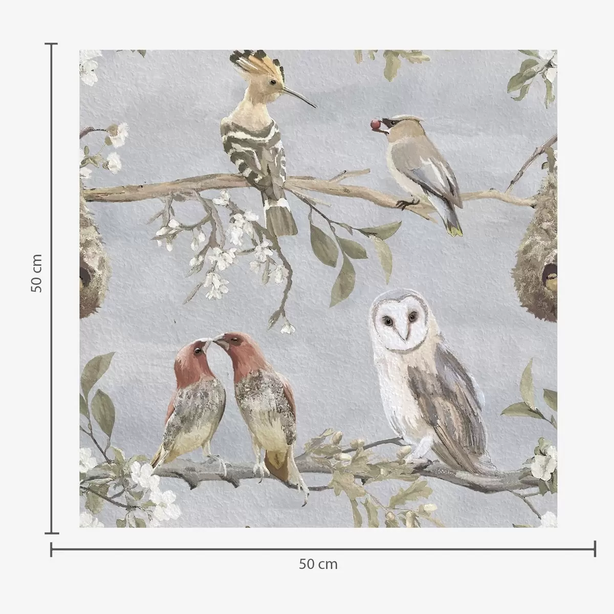 Papel tapiz Pájaros en ramas con flores sobre fondo gris Nr. a00738