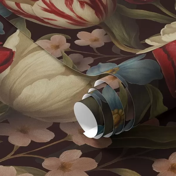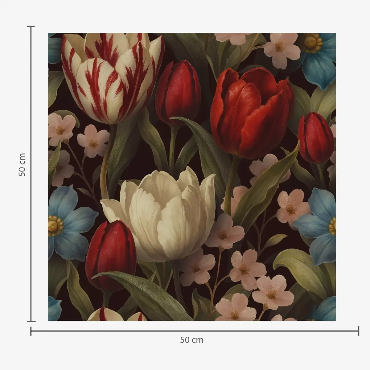 Papel tapiz Tulipanes brillantes y flores azules sobre fondo oscuro Nr. a00746