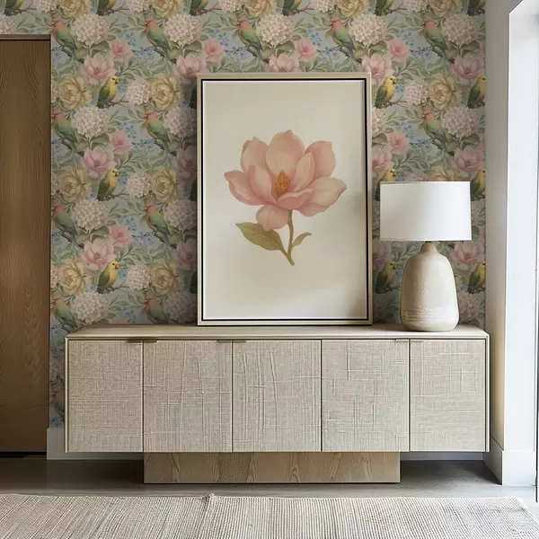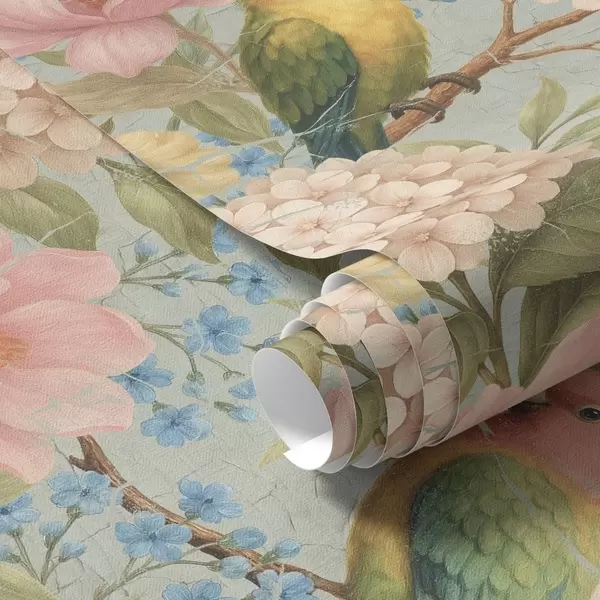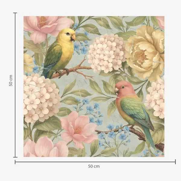 Papel tapiz Loros entre peonías, hortensias y magnolias Nr. a00747