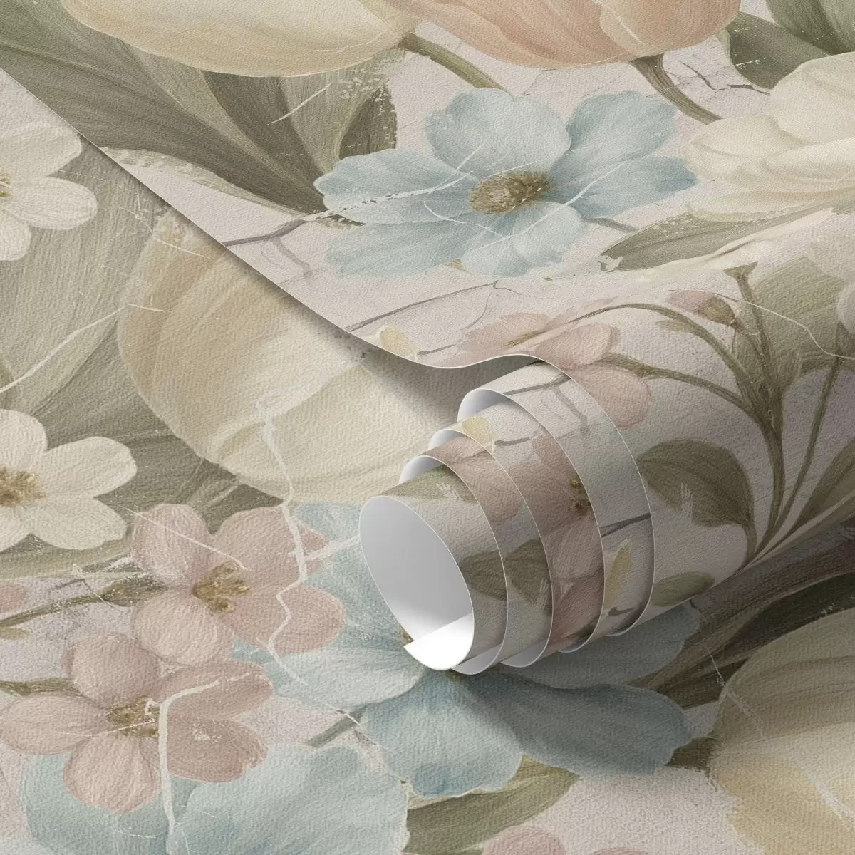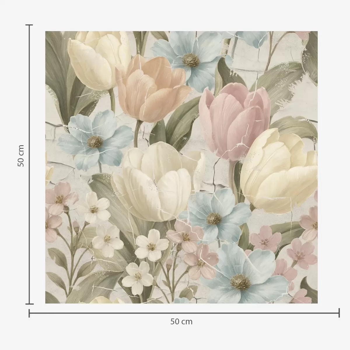 Papel tapiz Tulipanes y flores en tonos pastel sobre un fondo claro agrietado Nr. a00756