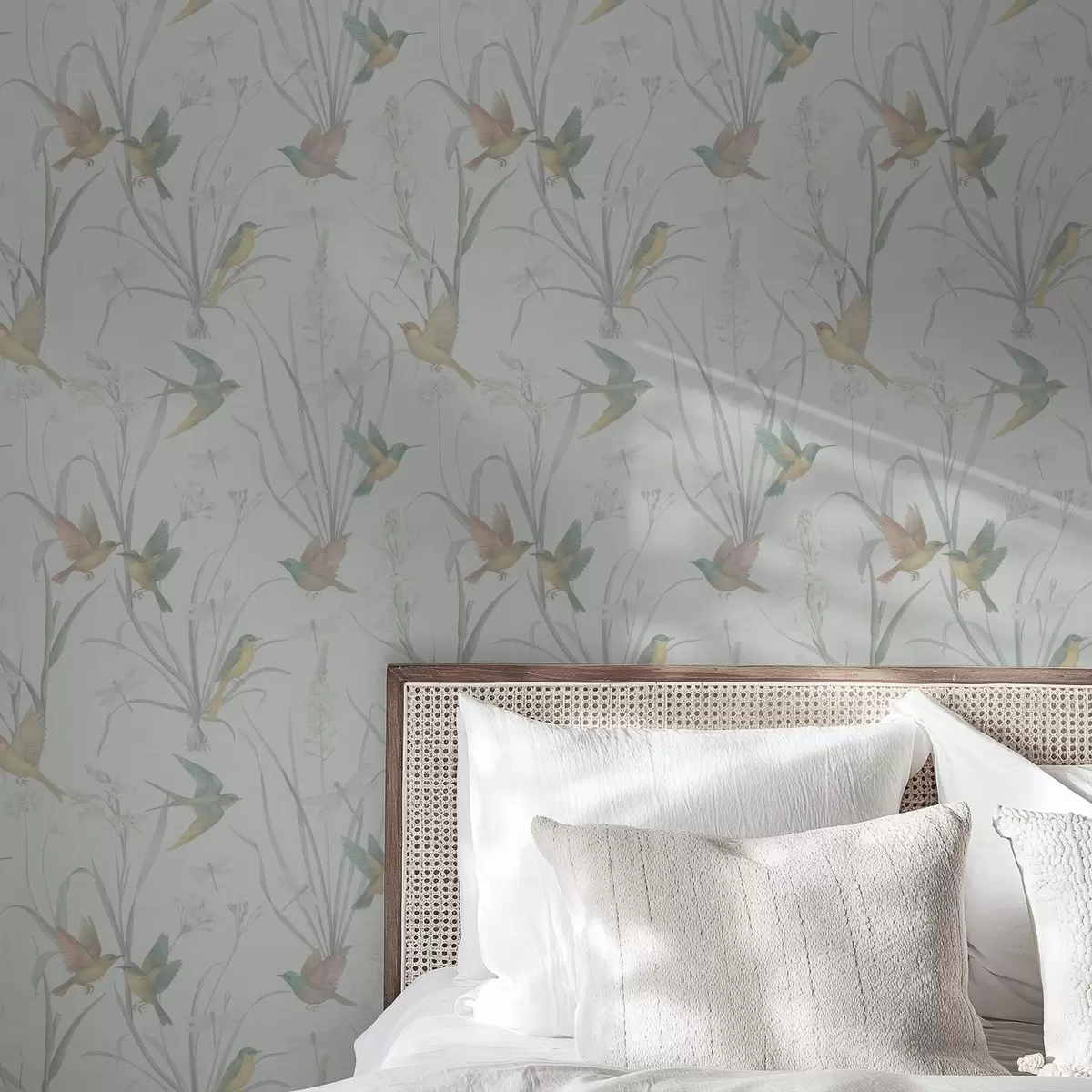 Papel tapiz Pájaros entre la hierba del prado sobre un fondo gris claro. Nr. a00776v1