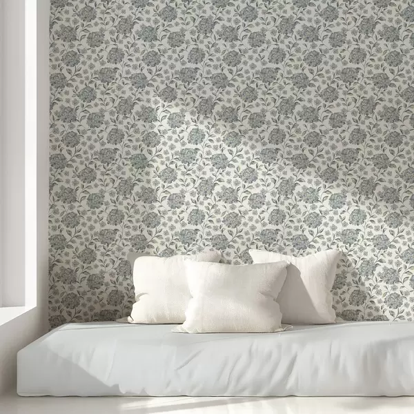 Papel tapiz Flores y hojas frondosas en una paleta de colores gris azulados. Nr. a00778