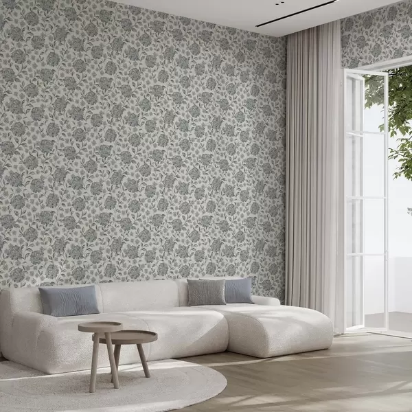 Papel tapiz Flores y hojas frondosas en una paleta de colores gris azulados. Nr. a00778