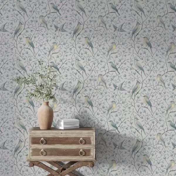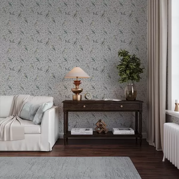 Papel tapiz Pájaros en las ramas, esquema gris azulado Nr. a00782