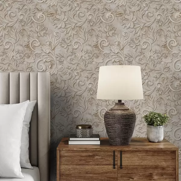 Papel tapiz Relieve en piedra con volutas florales, beige vintage Nr. a00784