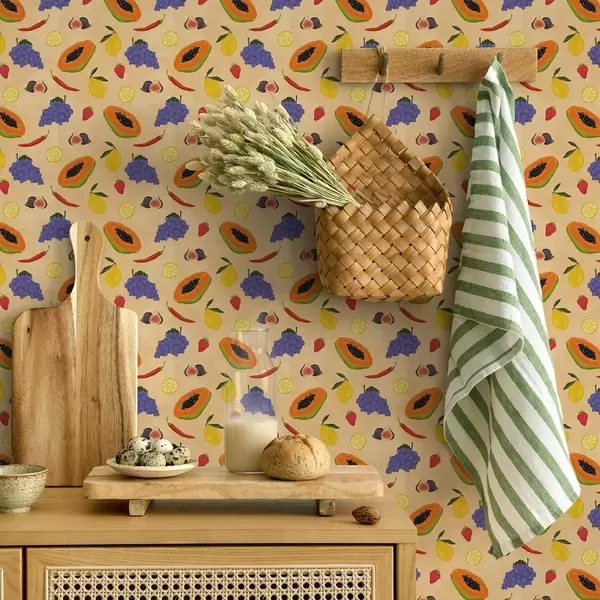 Papel tapiz Papaya, cítricos y bayas sobre un fondo cálido y rico Nr. a00803v1