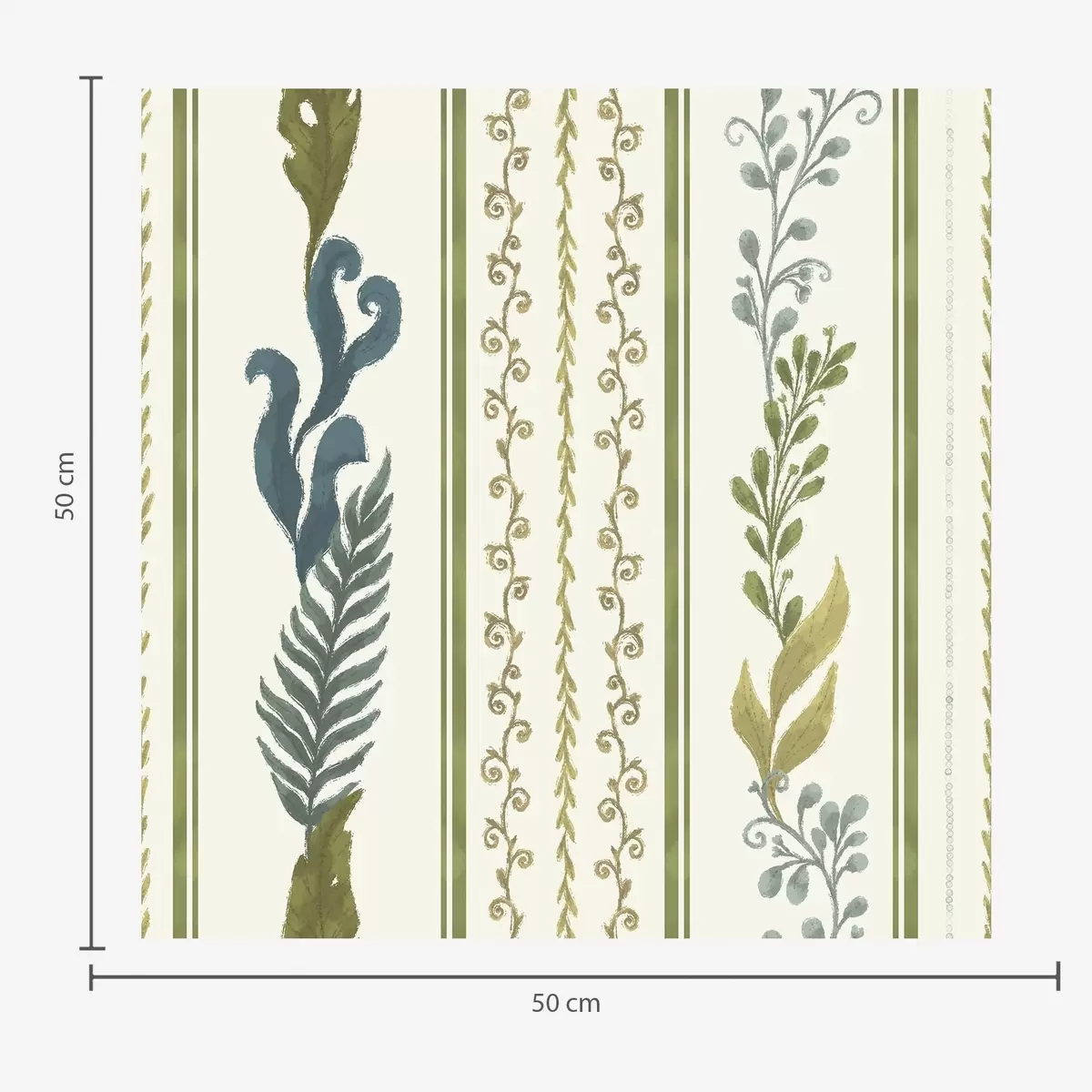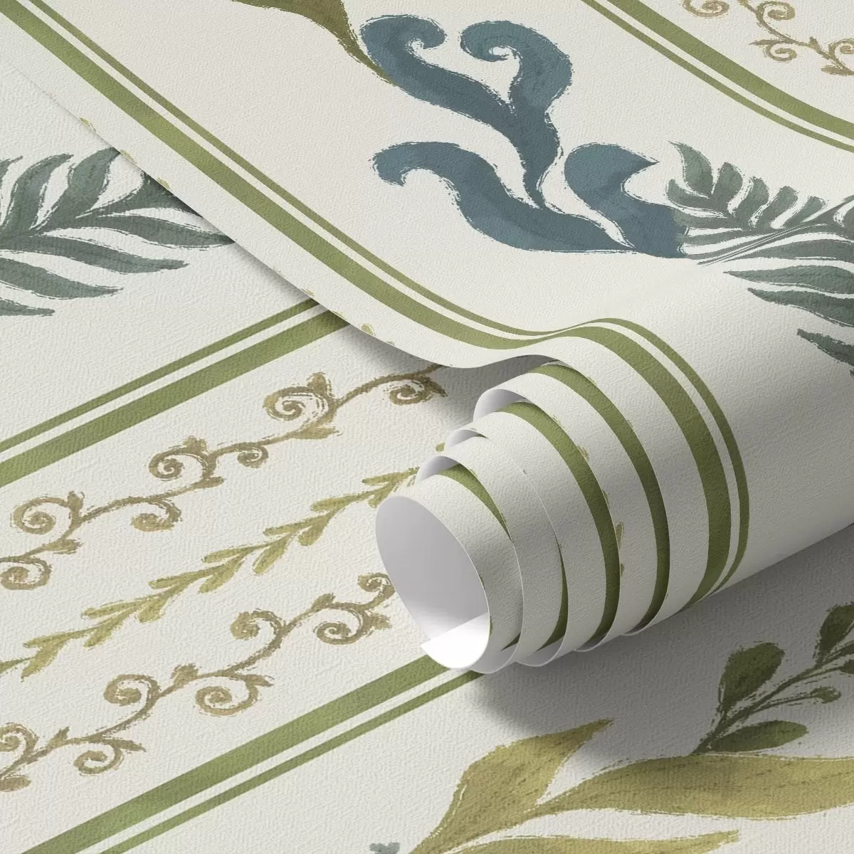 Papel tapiz Rayas con adornos en espiral y grandes ramas en tonos verdes Nr. a00823