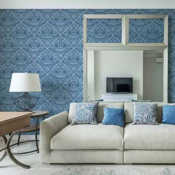 Papel tapiz Damasco en tonos azules fríos, contraste más fuerte. Nr. a00826v2