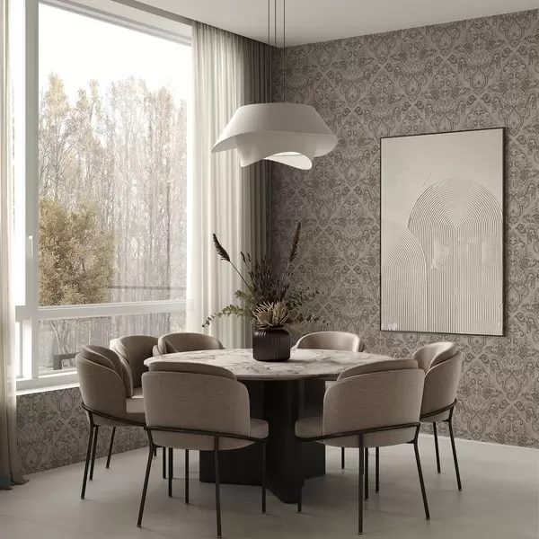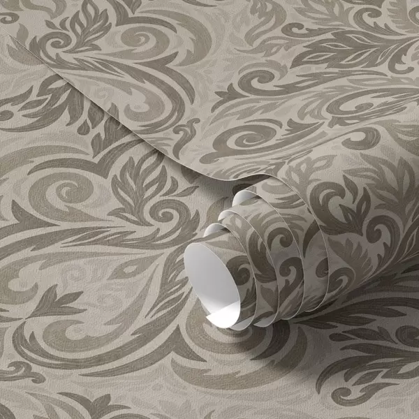 Papel tapiz Damasco en tonos cálidos gris-marrón sobre fondo claro. Nr. a00826v3