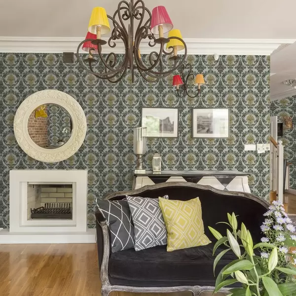 Papel pintado Damasco con volutas verdes sobre fondo claro. a00828v1