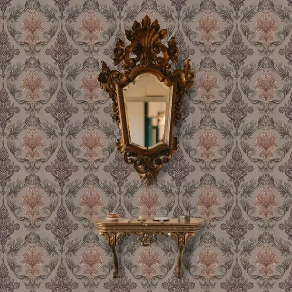 Papel tapiz Damasco en tonos marrón-terracota, fondo gris cálido. Nr. a00828v2