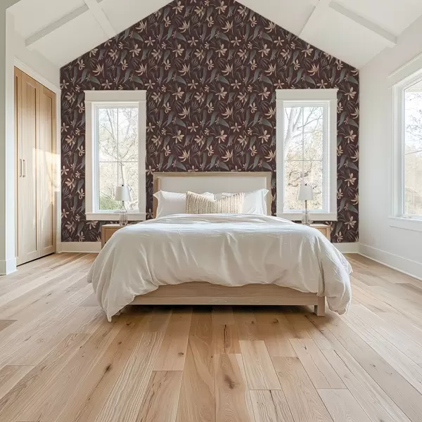 Papel tapiz Flores color crema con hojas grises sobre fondo burdeos. Nr. a00833