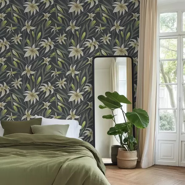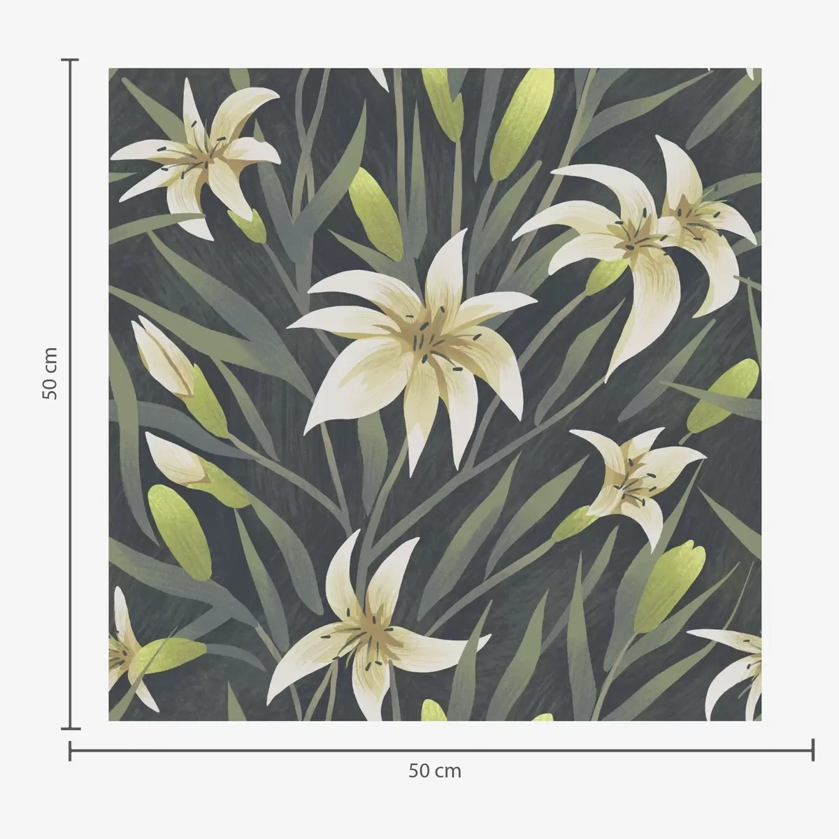Papel tapiz Lirios crema con hojas sobre fondo oscuro Nr. a00837v1