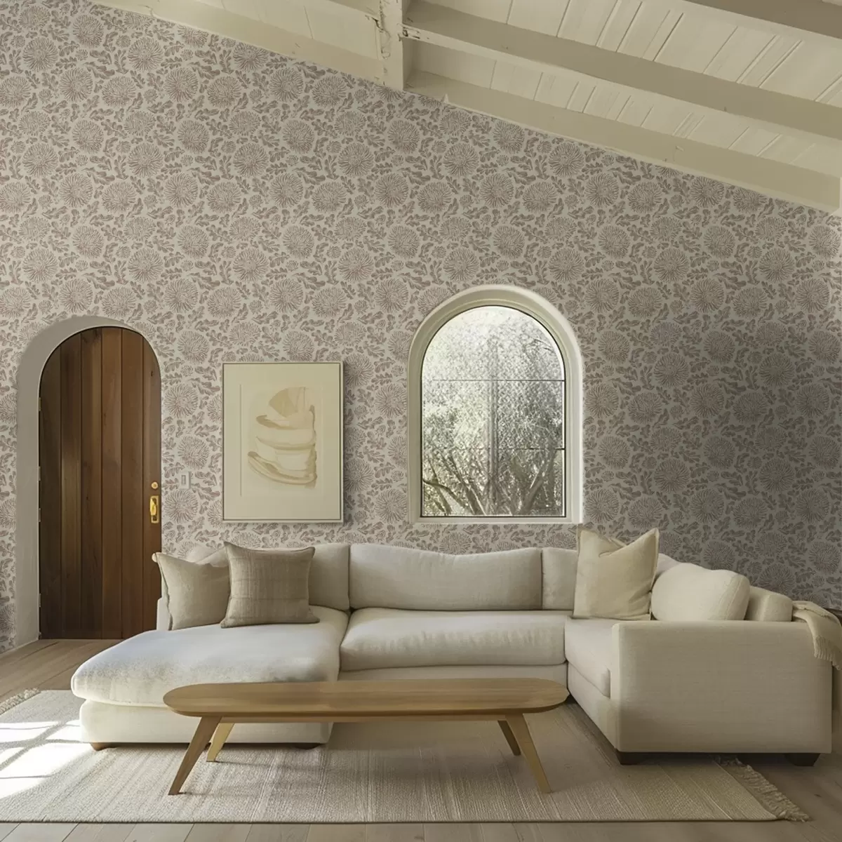 Papel tapiz Crisantemos y hojas de roble en suave marrón beige. Nr. a00840
