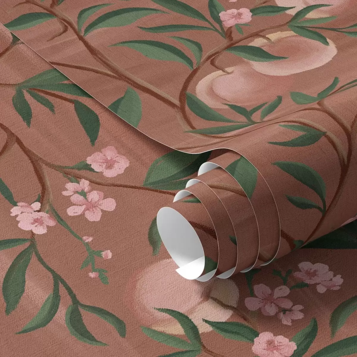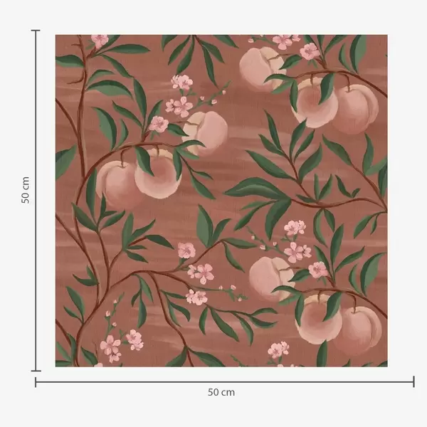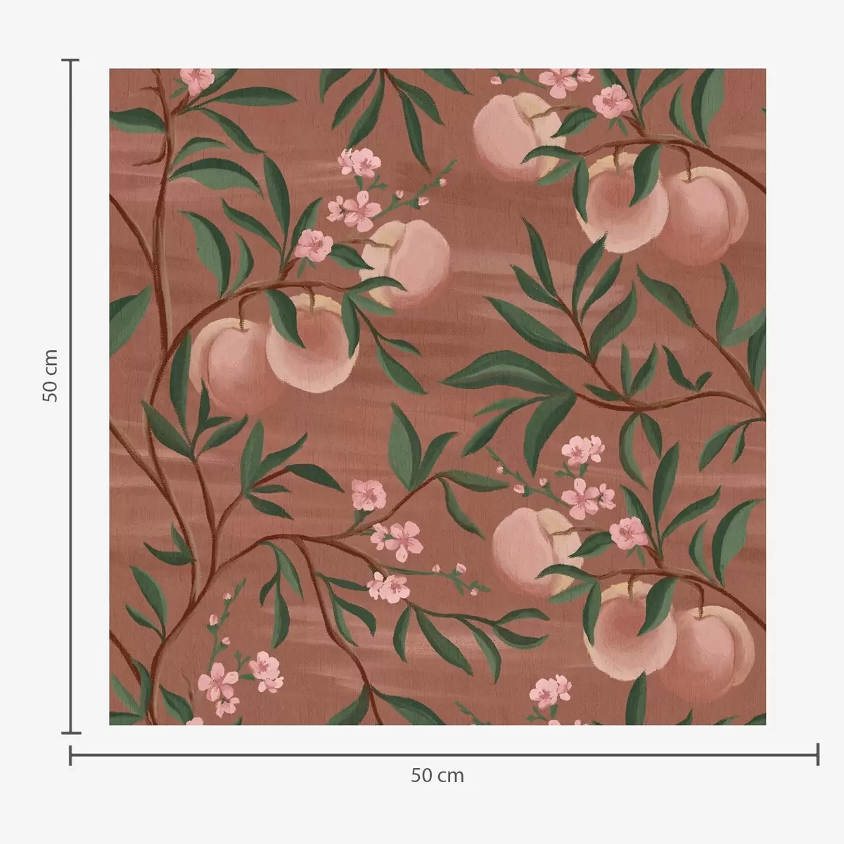 Papel tapiz Melocotones en ramas con flores rosas, suelo de terracota Nr. a00856