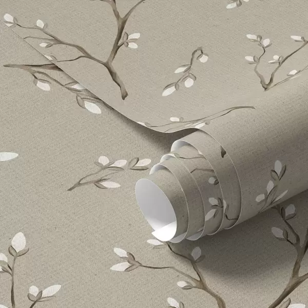 Papel tapiz Ramitas con brotes blancos sobre fondo gris topo lino Nr. a00861
