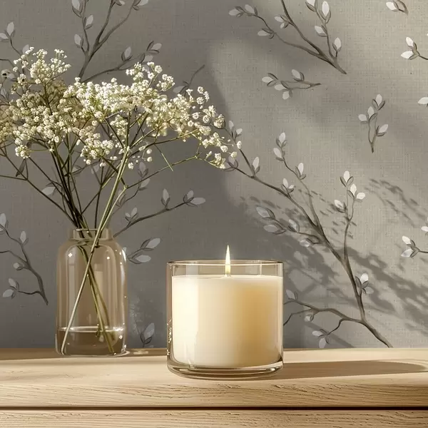 Papel tapiz Ramitas con brotes blancos sobre fondo gris topo lino Nr. a00861