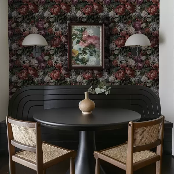 Papel tapiz Peonías oscuras y dramáticas, bayas y mariposa sobre fondo negro. Nr. a00862