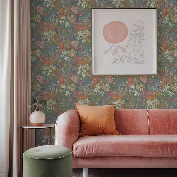 Papel tapiz Flores campestres pintadas sobre fondo verde salvia Nr. a00864