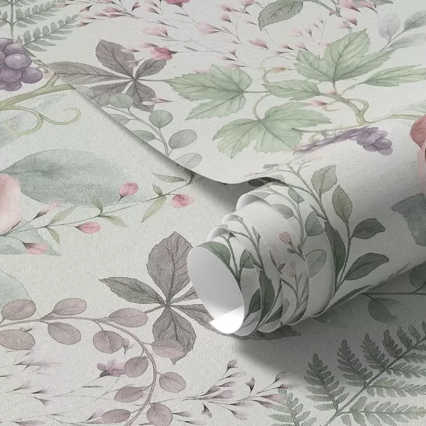 Papel tapiz Jardín en tonos pastel con rosas, helechos y uvas. Nr. a00867