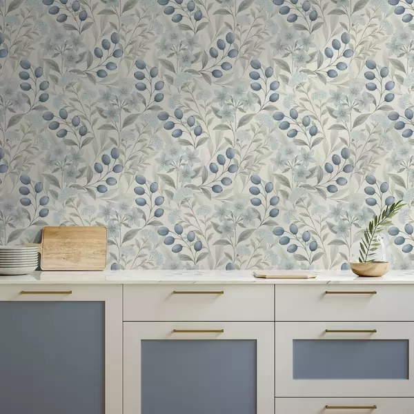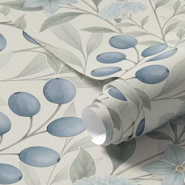 Papel tapiz Arándanos azules y flores claras sobre marfil Nr. a00872