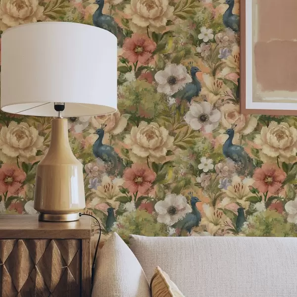 Papel tapiz Jardín pintoresco con pavos reales y flores grandes Nr. a00885