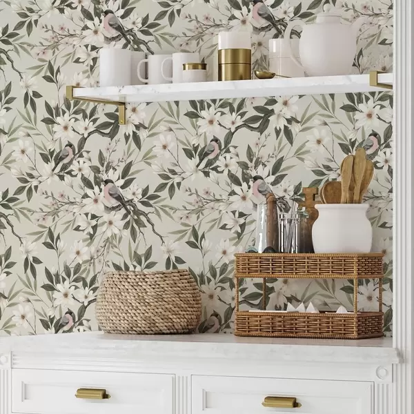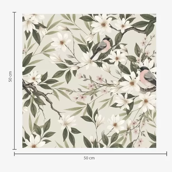 Papel tapiz Pintassilgos con el pecho blanco posados en ramas con flores color crema. Nr. a00889