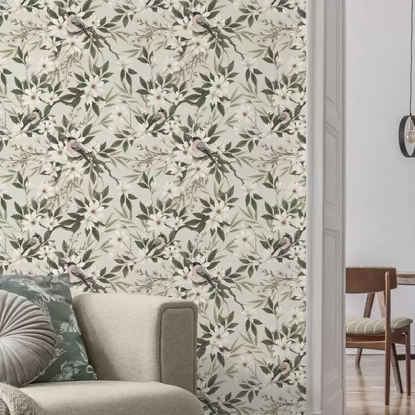 Papel tapiz Pintassilgos con el pecho blanco posados en ramas con flores color crema. Nr. a00889