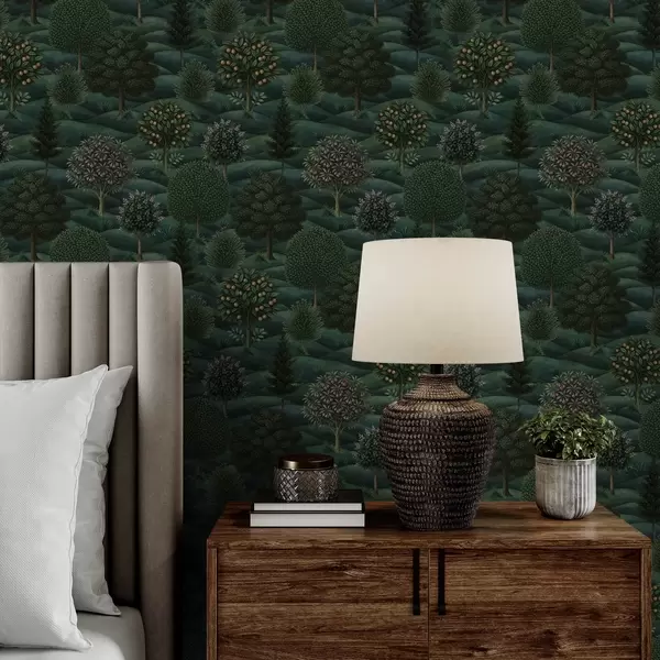 Papel tapiz Paisaje ondulado de un verde intenso con árboles dispuestos en patrones Nr. a00892