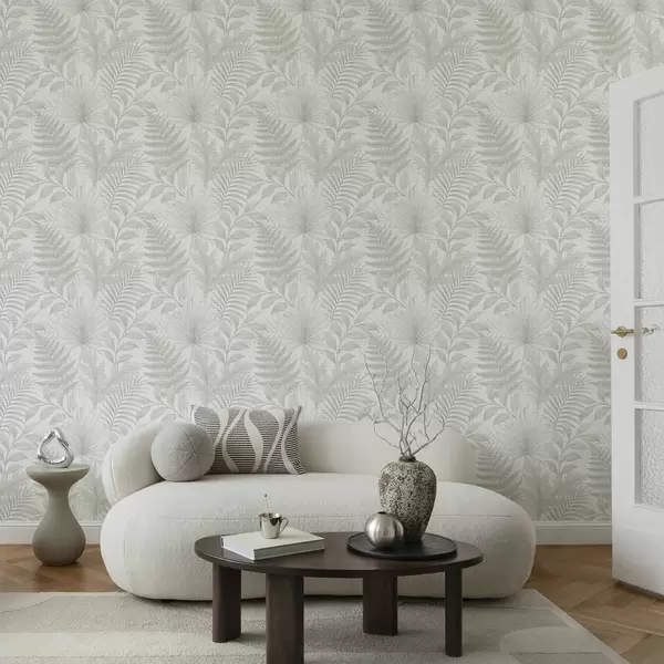 Papel tapiz Hojas tropicales suaves en gris pálido sobre textura de lino Nr. a00899
