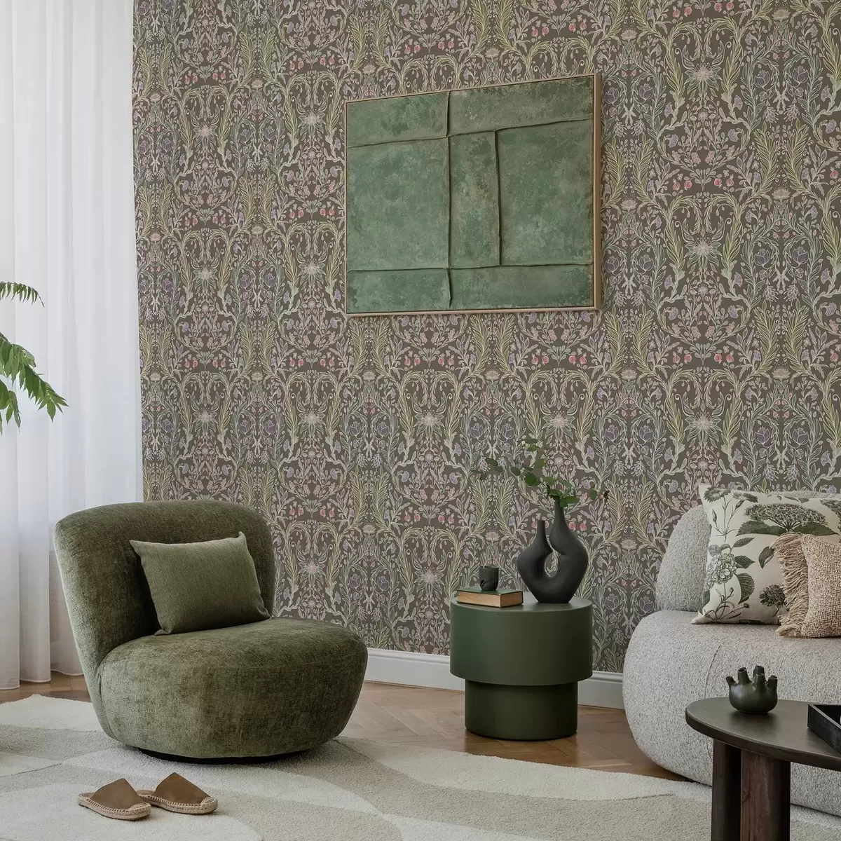 Papel tapiz Flores y hojas simétricas sobre un fondo gris marrón. Nr. a00928v2