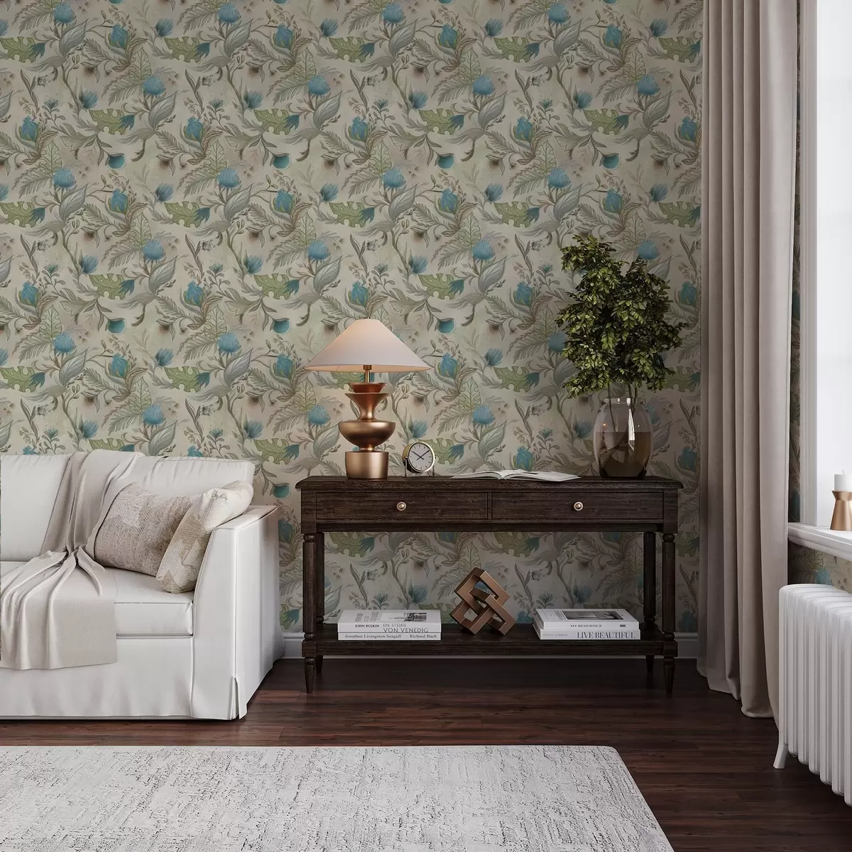 Papel tapiz Capullos y hojas azules sobre un fondo beige claro. Nr. a00930