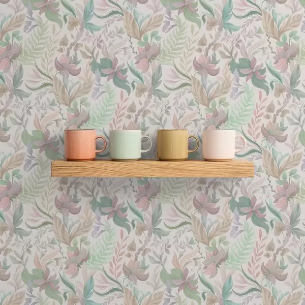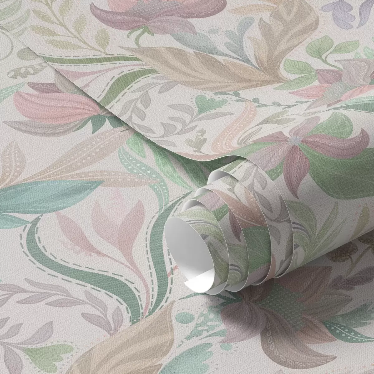 Papel tapiz Delicadas flores y hojas en tonos pastel sobre un fondo claro. Nr. a00931