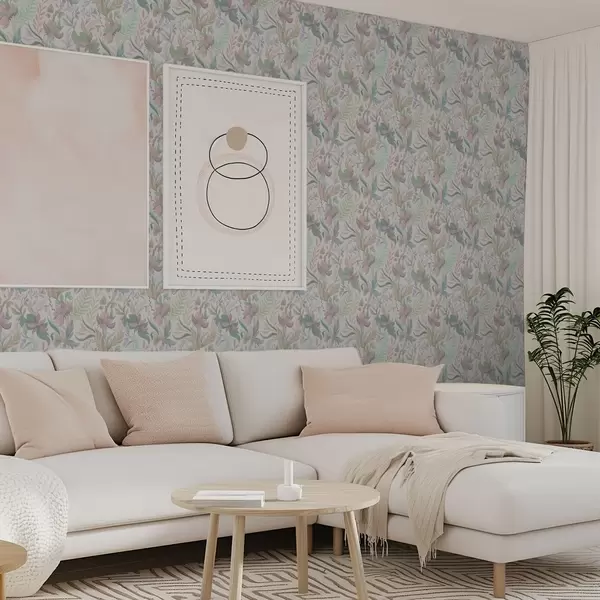 Papel tapiz Delicadas flores y hojas en tonos pastel sobre un fondo claro. Nr. a00931