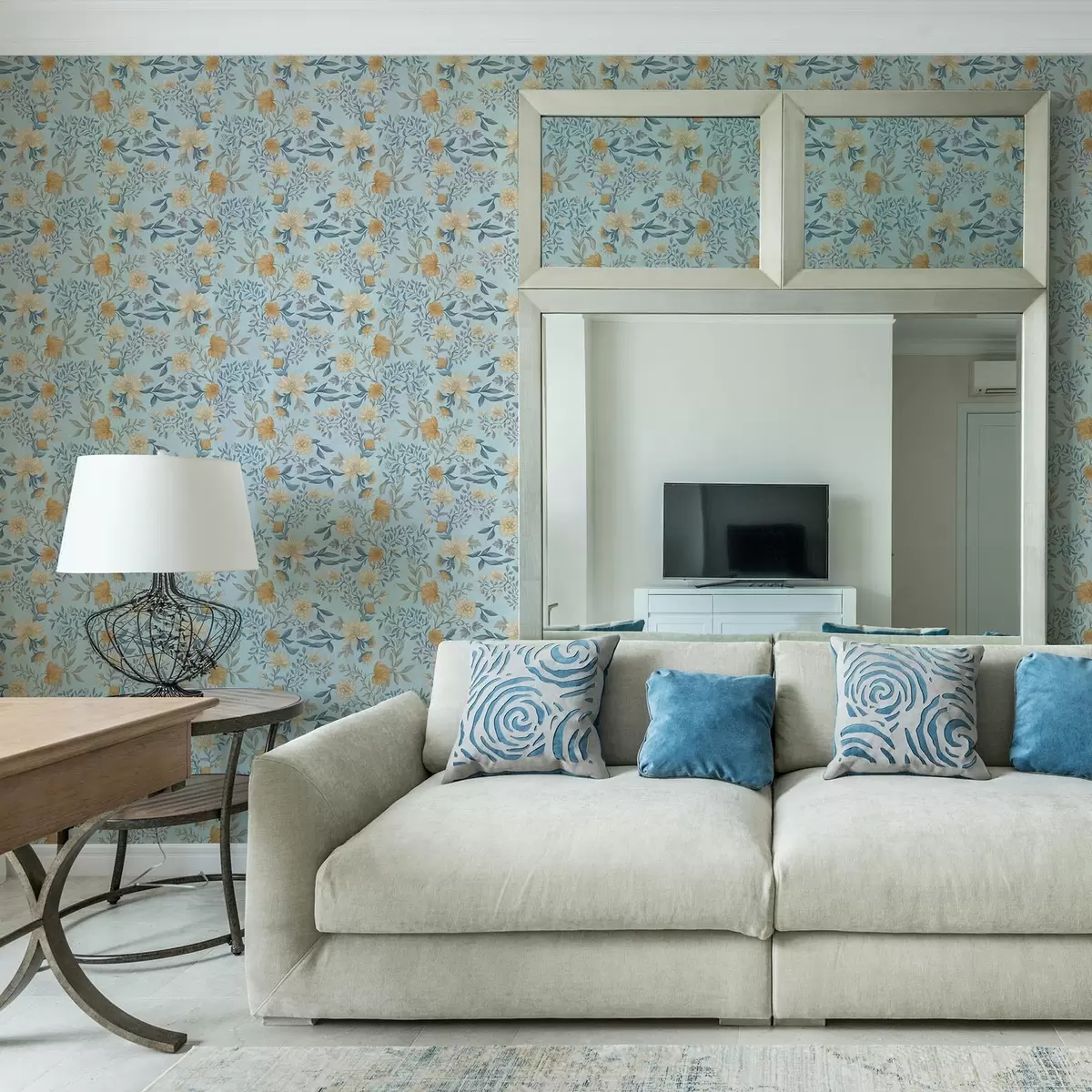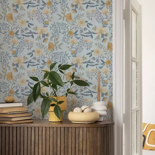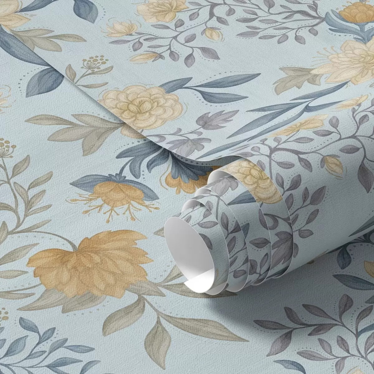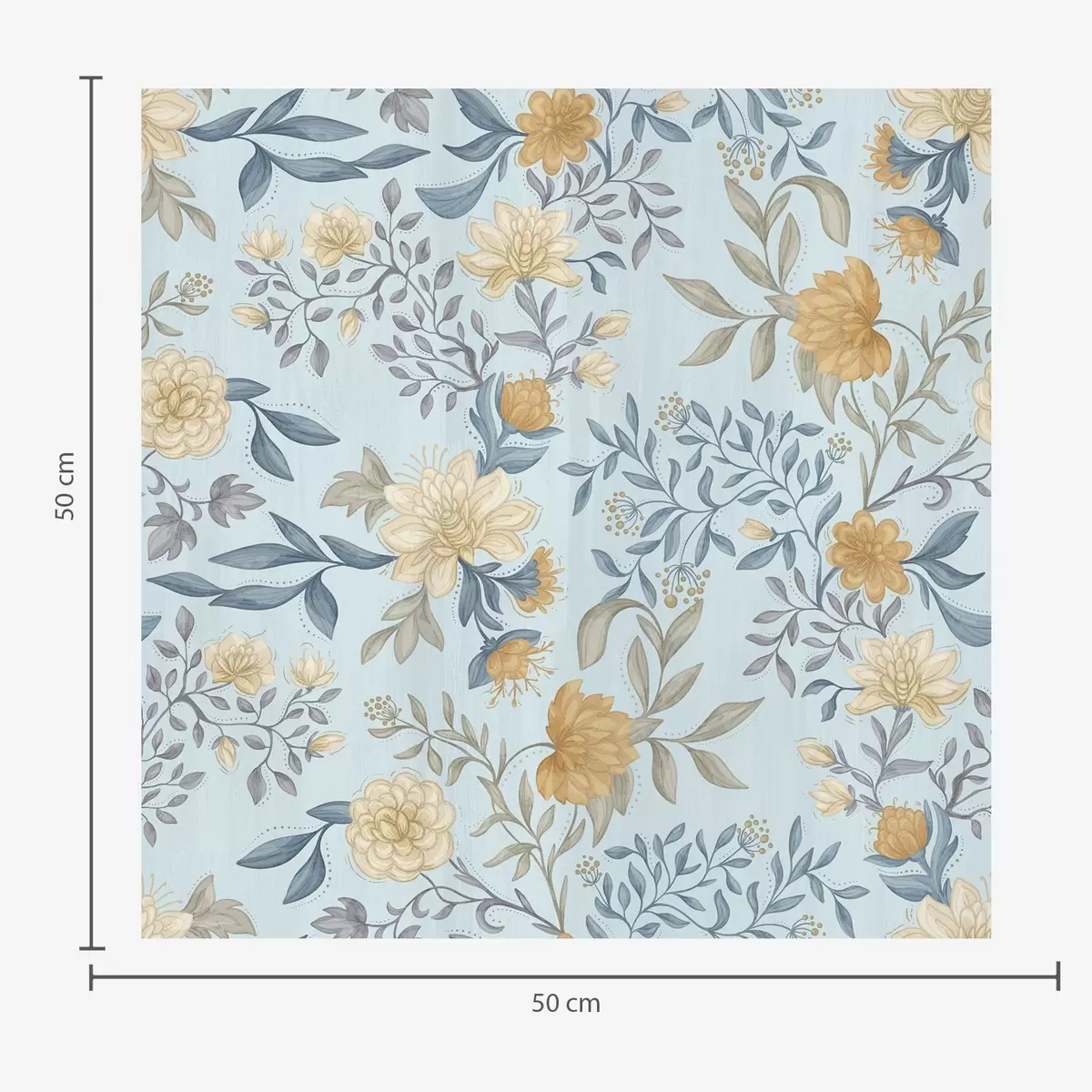 Papel tapiz Flores amarillas y azules con hojas sobre un fondo azul cielo. Nr. a00934