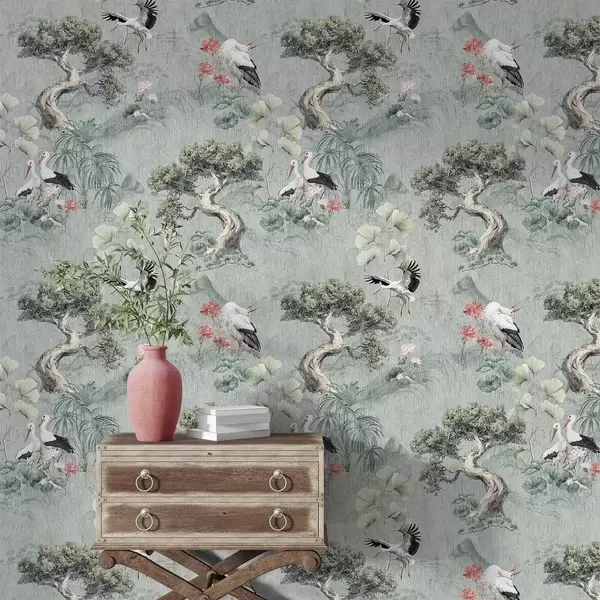 Papel tapiz Grullas entre pinos y lotos sobre un tranquilo fondo verde Nr. a00962
